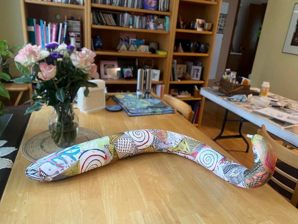 One particularly special moment from our time together happened during a session when I brought along my small gourd figurine of a little guy playing the flute. This sparked a memory for Malkah—she had a large gourd sitting in her basement that she had always wanted to decorate, but it belonged to her daughter. Inspired by our conversation, she had a realization: what if they worked on it together?